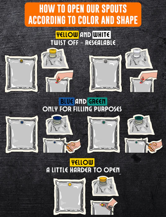 Once the bag is open, you can re-close it with the yellow cap or tie it well in case it has the Blue/Green Spout and you had to cut it. Make sure to remove all oxygen inside. Once this is done you can refrigerate it for up to one week or freeze it for up to 6 months.